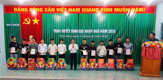 Sáng ngày 11/02/2026, Hội đồng Nghĩa vụ quân sự xã Vĩnh Hòa đã long trọng tổ chức buổi họp mặt trao Quyết định gọi công dân nhập ngũ và thực hiện nghĩa vụ tham gia Công an nhân dân năm 2026.