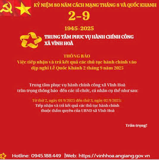 Để tạo điều kiện cho người dân thực hiện các Thủ tục hành chính trong kỳ nghỉ Lễ Quốc khánh 02/9, Trung tâm phục vụ hành chính công xã Vĩnh Hòa thông báo tiếp nhận và trả kết quả hồ sơ của cá nhân và tổ chức dịp Lễ Quốc khánh 02/9 (từ ngày 01 - 03/9/2025) các Thủ tục hành chính thuộc thẩm quyền giải quyết của UBND xã Vĩnh Hòa!