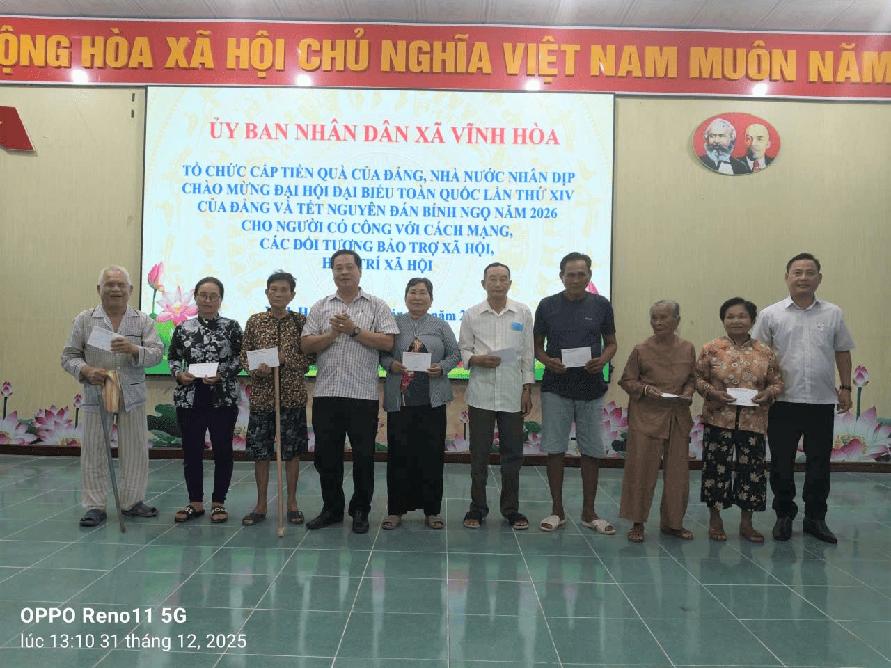 Thực hiện Nghị quyết Số 418/NQ-CP ngày 28/12/2025 của Chính phủ về việc tặng quà của Đảng, Nhà nước nhân dịp chào mừng Đại hội đại biểu toàn quốc lần thứ XIV của Đảng và Tết Nguyên đán Bính Ngọ năm 2026 cho người có công với cách mạng, các đối tượng bảo trợ xã hội, hưu trí xã hội và các đối tượng yếu thế khác. Ngày 31/12/2025, Uỷ ban nhân xã Vĩnh hoà tổ chức cấp tiền quà cho tất cả các đối tượng theo Nghị quyết Số 418/NQ-CP ngày 28/12/2025 của Chính phủ, đảm bảo cấp phát đúng đối tượng theo quy định. Chủ tịch UBND xã chỉ đạo các ngành phối hợp chặt chẽ các ấp tập trung hoàn thành việc cấp tiền theo sự chỉ đạo của trung ương.