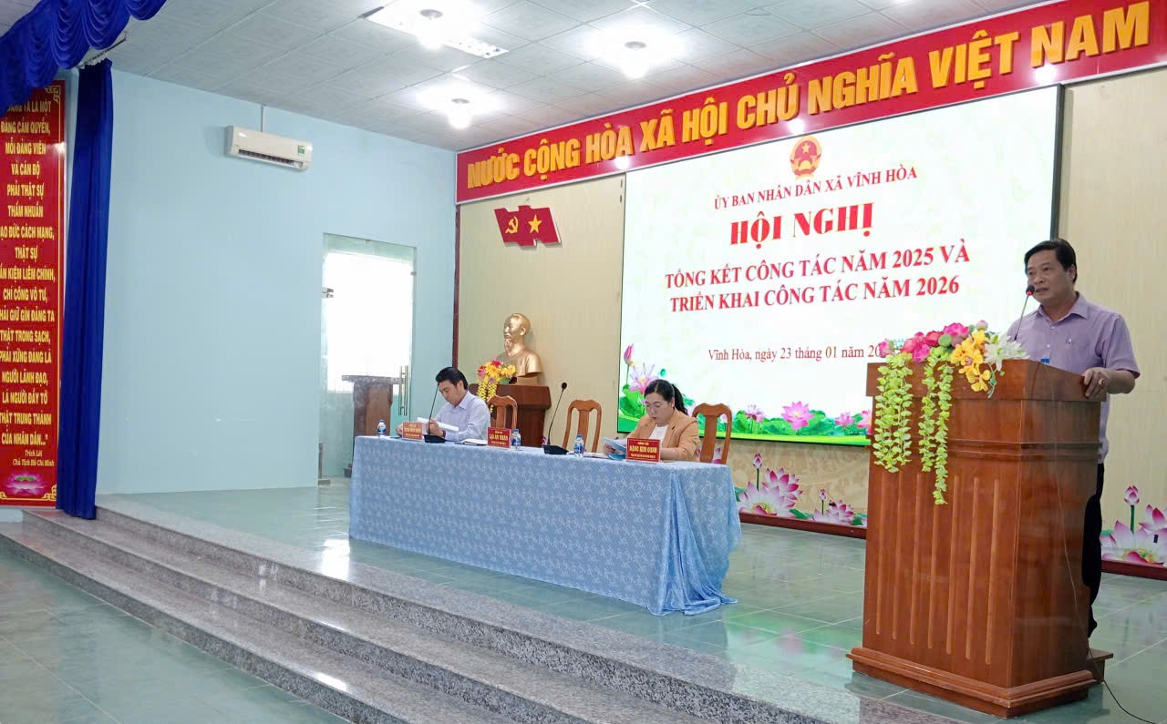 Chiều ngày 23/01/2026, UBND xã Vĩnh Hoà tổ chức Hội nghị tổng kết công tác năm 2025 và triển khai phương hướng, nhiệm vụ năm 2026.